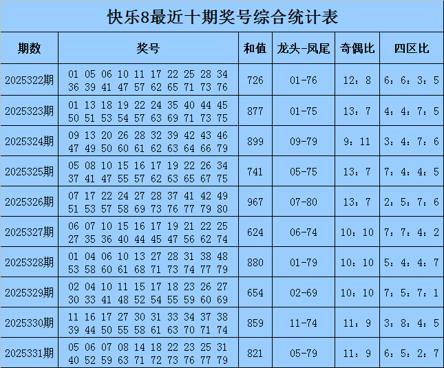 福彩舒坦8第2025331期开奖回来:05 06 07 08 14 18 22 23 25 31 40 52 59 63 71 72 73 76 77 79,其中奖号和值为821,跨度为74,奇偶比开出11:9,012路比开出4:9:7,四区比开出6:5:2:7。