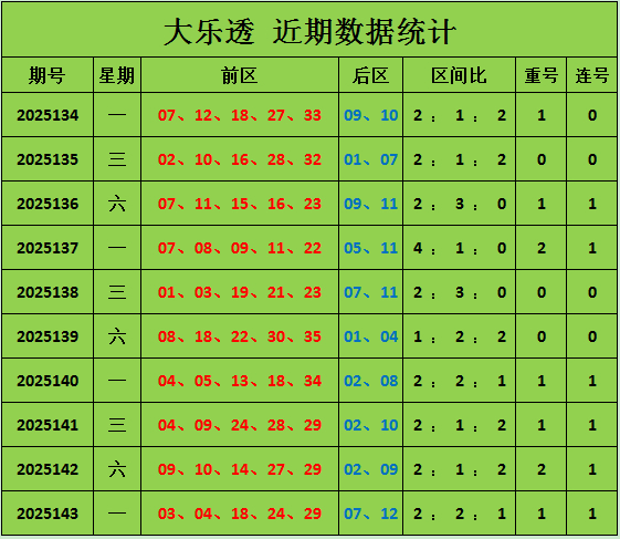 大乐透上期开出奖号:03 04 18 24 29+07 12,区间比是2 : 2 : 1,开出连号07 12,开出重号29。