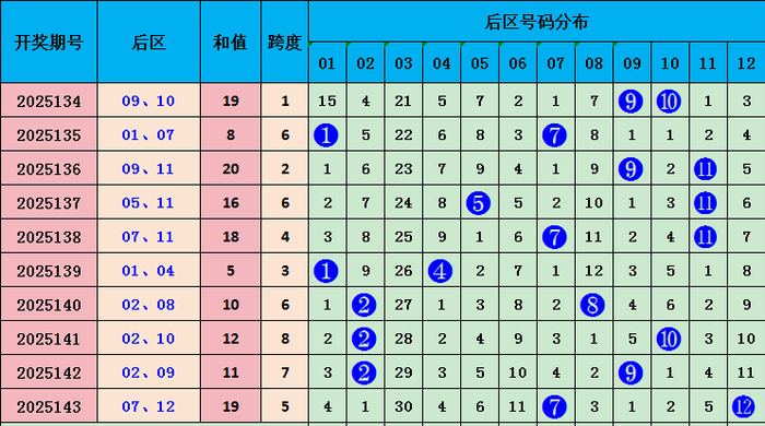 上期后区开出号码07 12,和值19,近十期和值19 8 20 16 18 5 10 12 11 19,和值波动范畴较大,本期预测和值会下落,要点关爱号码:06 09,和值15 。