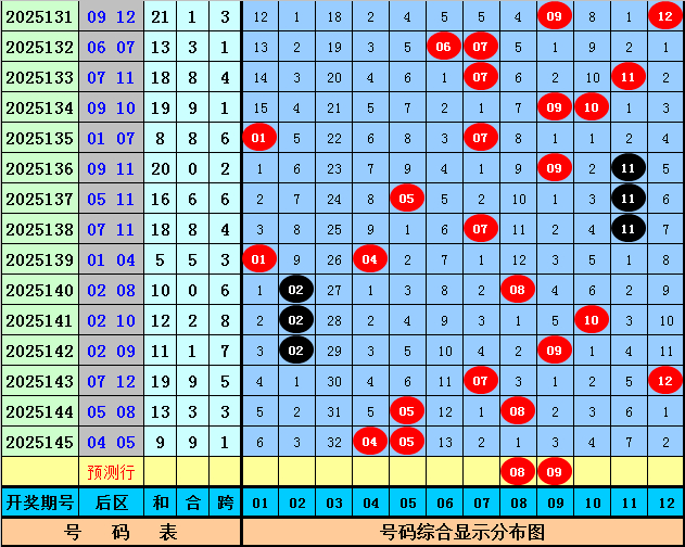 后区别析:上期该位开出奖号04和05,和值为9,跨度为1,后区前4次开出和值9和跨度1时,其下期奖号分别为:01+05、02+08、01+07、04+10,号码奇偶比为4:4,大小比为3:5,012路比为0:5:3,本期后区号码参考03、05、06、08、09,精选两码08、09。